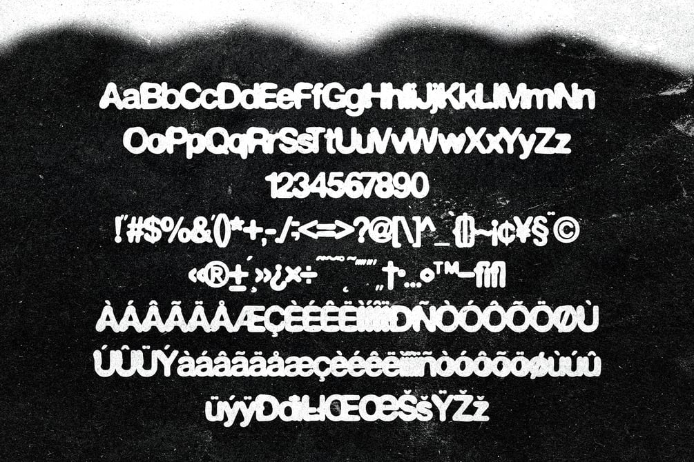 This font is a bold and expressive typeface with a textured, distressed appearance, perfect for projects that demand a raw and edgy aesthetic. It includes a full set of uppercase and lowercase letters, numerals, punctuation, symbols, and a wide range of accented characters to support multilingual use. The gritty texture adds a unique visual impact, making it ideal for posters, album covers, branding, and other creative works that aim to stand out. Its design strikes a balance between readability and artistic flair, offering versatility for various applications.